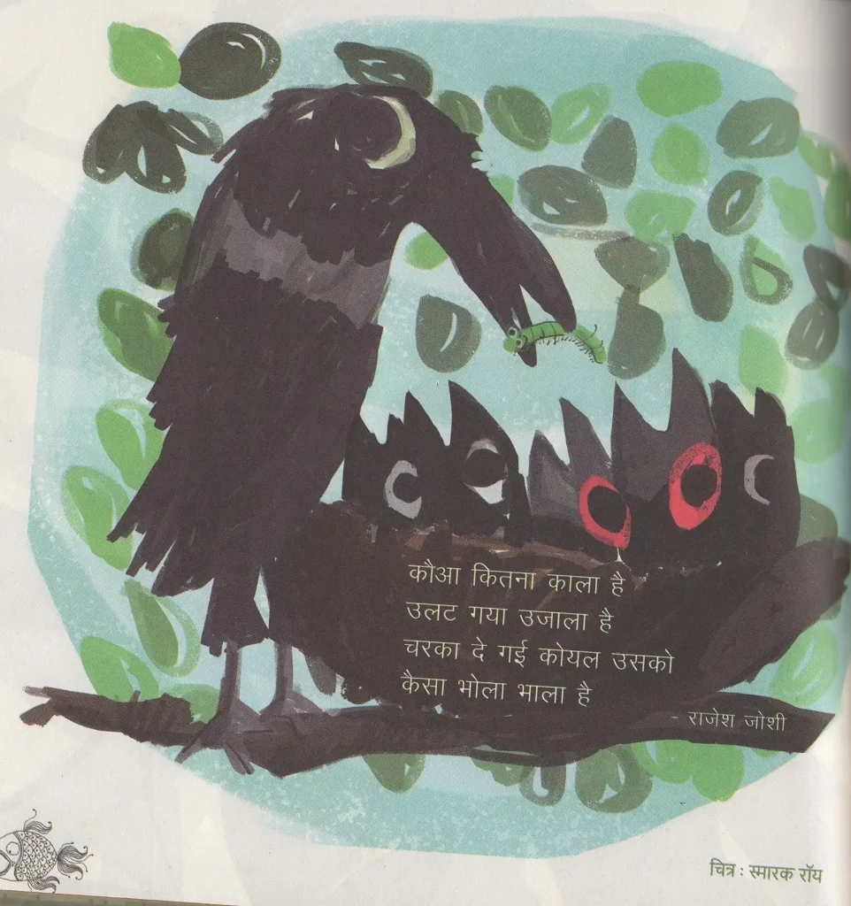 जैसे, राजेश जोशी की इस कविता “कौवा इतना काला है” को देखें। आमतौर पर बच्चों के लिए लिखी गई कविताएँ इस पंक्ति के बाद की पंक्ति में ‘काले’ को बयान करने के दो-चार प्रचलित तरीकों पर ही जाकर ठहर जाएँगी। मसलन, सुरमे की तरह काला, तवे की तरह काला, आदि। लेकिन एक भरी-पूरी कविता अपनी बात कहने के साथ-साथ, भाषा भी बनाती चलती है। एक उस्ताद ही लिख सकता है कि